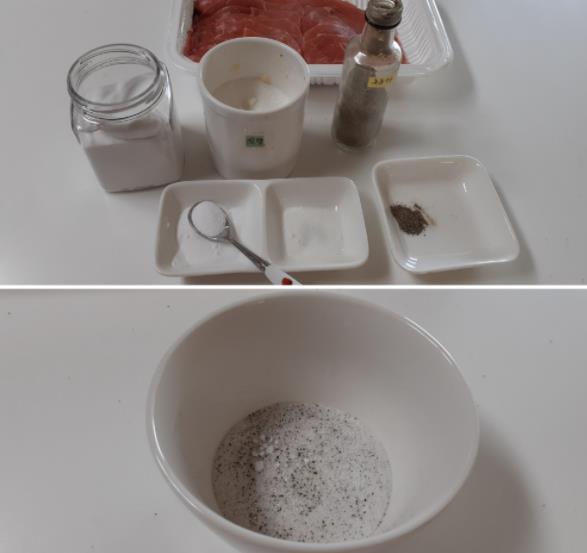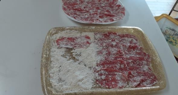 5. 밑간한 고기에 부침가루를 앞뒤로 얇게 골고루 묻혀줍니다.