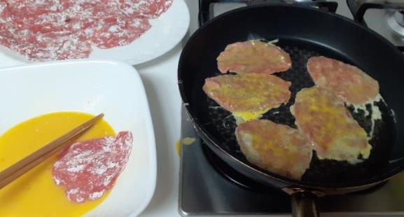 6. 고기에 계란물을 입혀 식용유를 넉넉히 부어 달군팬에 중약불에서 노릇하게 부쳐줍니다. (자주 뒤집지 말고 한면 익히고 한번 뒤집어 다른 쪽 한면을 익혀 주어요)