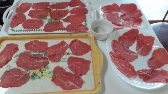 2. 소고기에 밑간용 소금(소금3T, 설탕2T. 후추 1/3T) 를 뿌려줍니다. (한꼬집씩 집어 고기 두어쪽 정도에 뿌려주어요. 실제 밑간에 사용된 양은 처음양의 1/2T정도입니다)