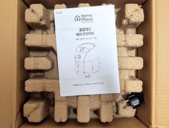 패키지에 에어프라이어 +설명서가 들어있습니다. -하드 보호지가 에어프라이어 본체를 잘 감싸고 있어서 흠집, 기능 이상은 없었습니다.