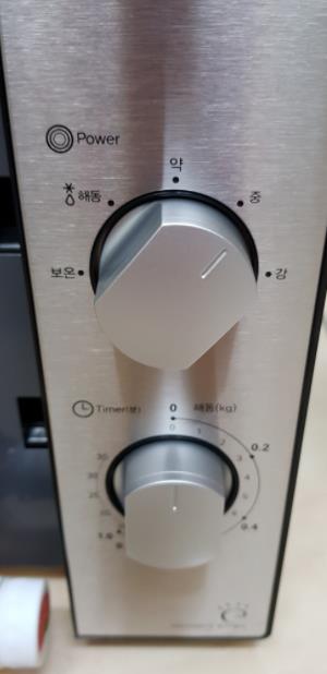 해동시엔 윗 다이얼을 해동으로 돌려놓고 아랫쪽 타이머로 조절하구요. 데우기는 윗 다이얼을 보온이나 약 중 강으로 돌려