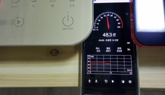 소음 테스트 입니다. 에어컨 켰기때문에 둘다 감안했고 물 끓는 동안 발생하는 펜 작동 소음입니다. 타브랜드제품은 최대 57.6dB 평균 54.6dB 이고 단미는 최대 53.8dB 평균 49.7dB 로 단미가 조금 더 조용합니다.