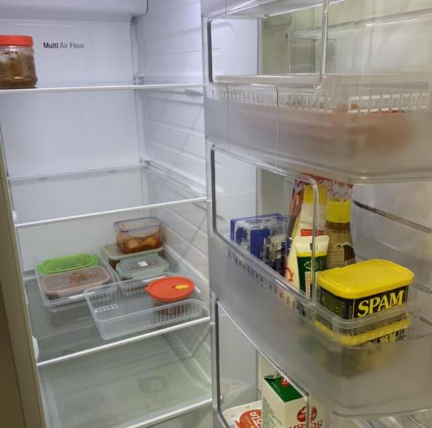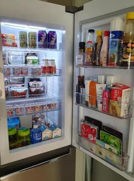 1) 수납공간은 만족해요. 일단 냉장고가 양문형 형태지만 또 하나의 문이 더 있네요. 그 문에도 음료 등을 넣을 수 있는 수납공간이 있답니다. 작은 양념병이나 캔 음료 등을 수납할 수 있네요. 냉장고 전체적으로 보면 냉장고에 수납할 수 있는 공간이 상당히 많답니다.