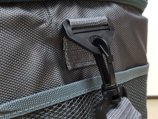 쿨러백 내부, 뒤쪽에 다른 주머니는 없고, 양옆쪽에만 물병 꽂이용 메쉬 포켓이 있습니다. 탈부착 어깨 끈이 있는데, 특별하진 않습니다. 저는 잘 사용하지 않아서 실 사용시에는 뺐습니다.