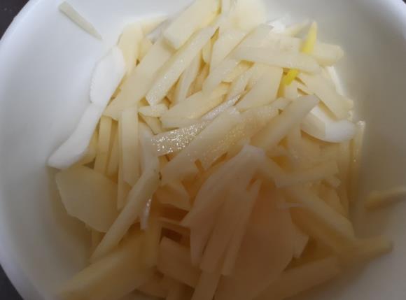 껍질을 깍으니 껍질도 얇고 잘깍아졌어요. 물로 표면을 씻으니 흙이 씻겨져 나가네요. 흙감자 왠지 정이 가요 하하! 감자속살은 뽀얀것이 표면이 맨들해요. 안에도 썩은것 하나 없구요. 단면을 송송 잘라서 물에 헹구어 전분기를 제거해주고 양파도 송송썰어서 볶아주었답니다.